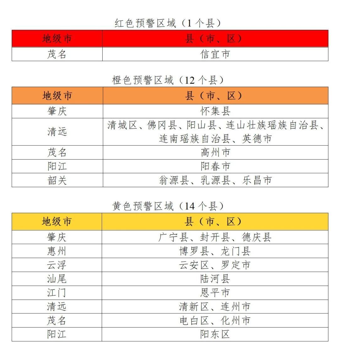 肇庆怀集县,清远清城区、佛冈县、阳山县、连山壮族瑶族自治县、连南瑶族自治县、英德市,茂名高州市,阳江阳春市,韶关翁源县、乳源县、乐昌市,局地发生山洪灾害可能性大(橙色预警)。